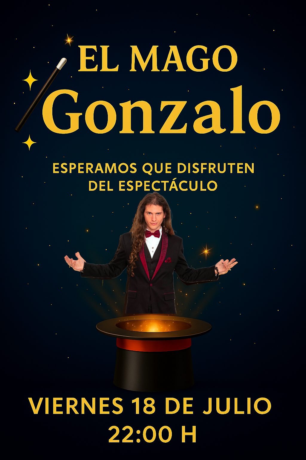 Este viernes a las 22:00 h, el escenario se llena de ilusión con la actuación de El Mago Gonzalo, un espectáculo para toda la familia que no querrás perderte.